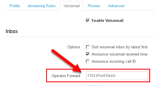 A custom voicemail greeting that announces the option when pressing "0" should also be uploaded.