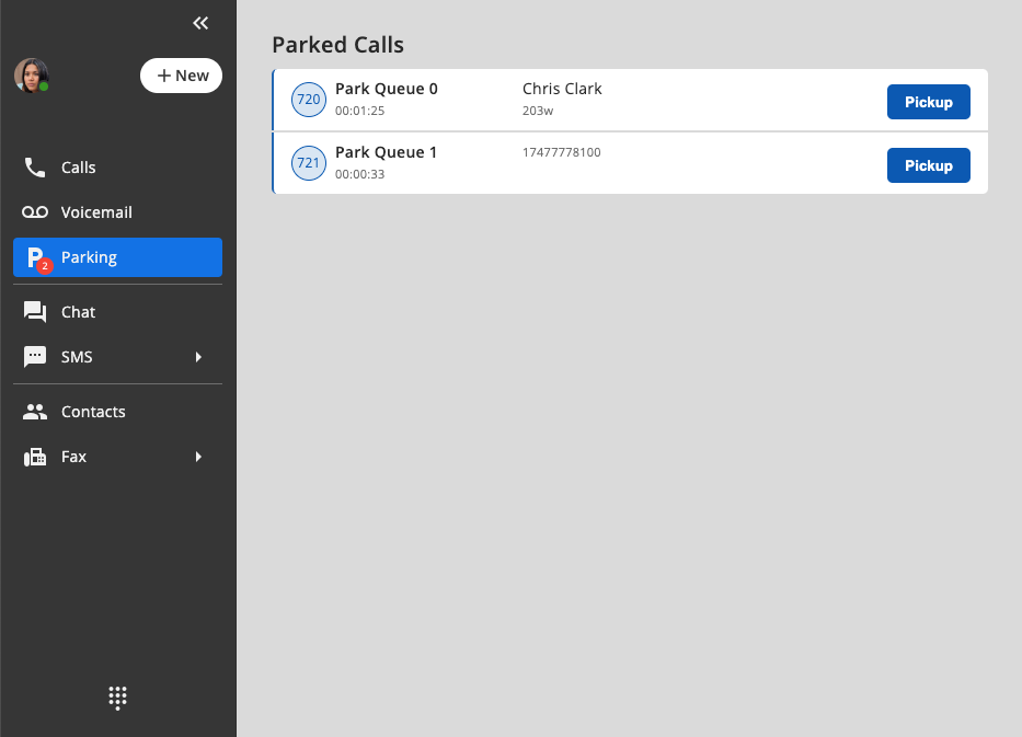 If the user enters the Parking tab, they will be able to see how long each call has been parked, and they have the option to click ‘Pickup’ a call to enter an active call.