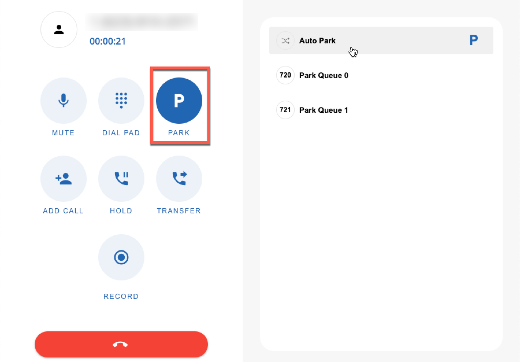 ConnectUC users can park an active call by clicking the ‘Park’ button in the active call menu. The ‘Park’ button allows the user to either automatically park the call or they may choose a specific location to park the call. Selecting 'Auto Park' will park a call in the first available park queue (numerically by extension).