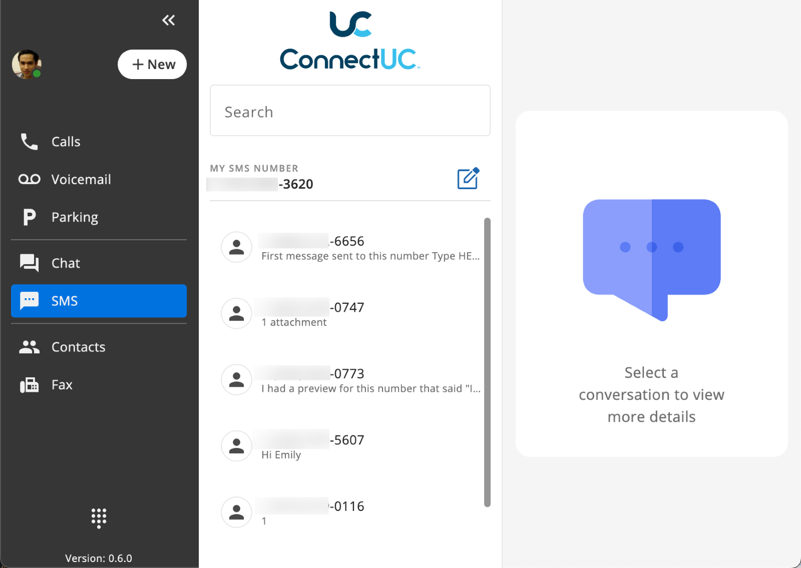 The ConnectUC SMS tab allows you to create, view, and manage SMS conversations.